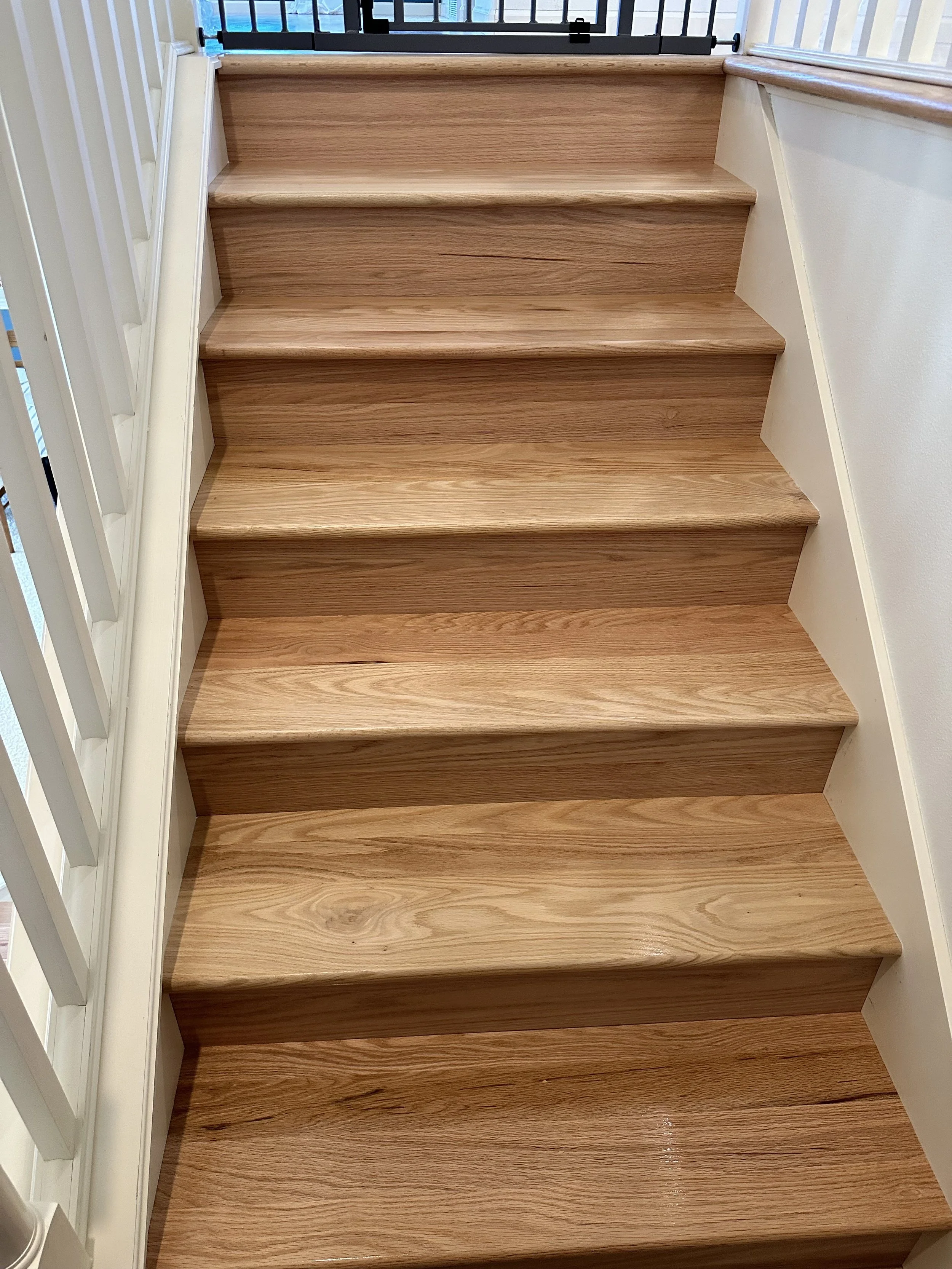 Installation of red oak stair treads and risers, viewed from the top.
