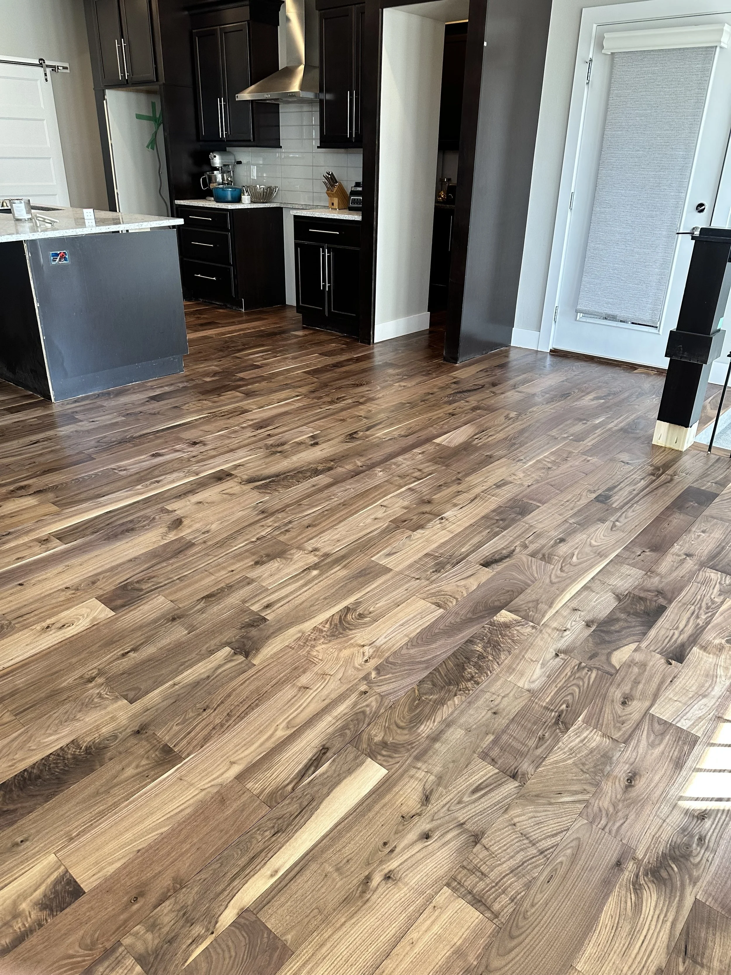 Walnut hardwood flooring with a natural finish in a kitchen. Sanded and refinished to eliminate sun damage.