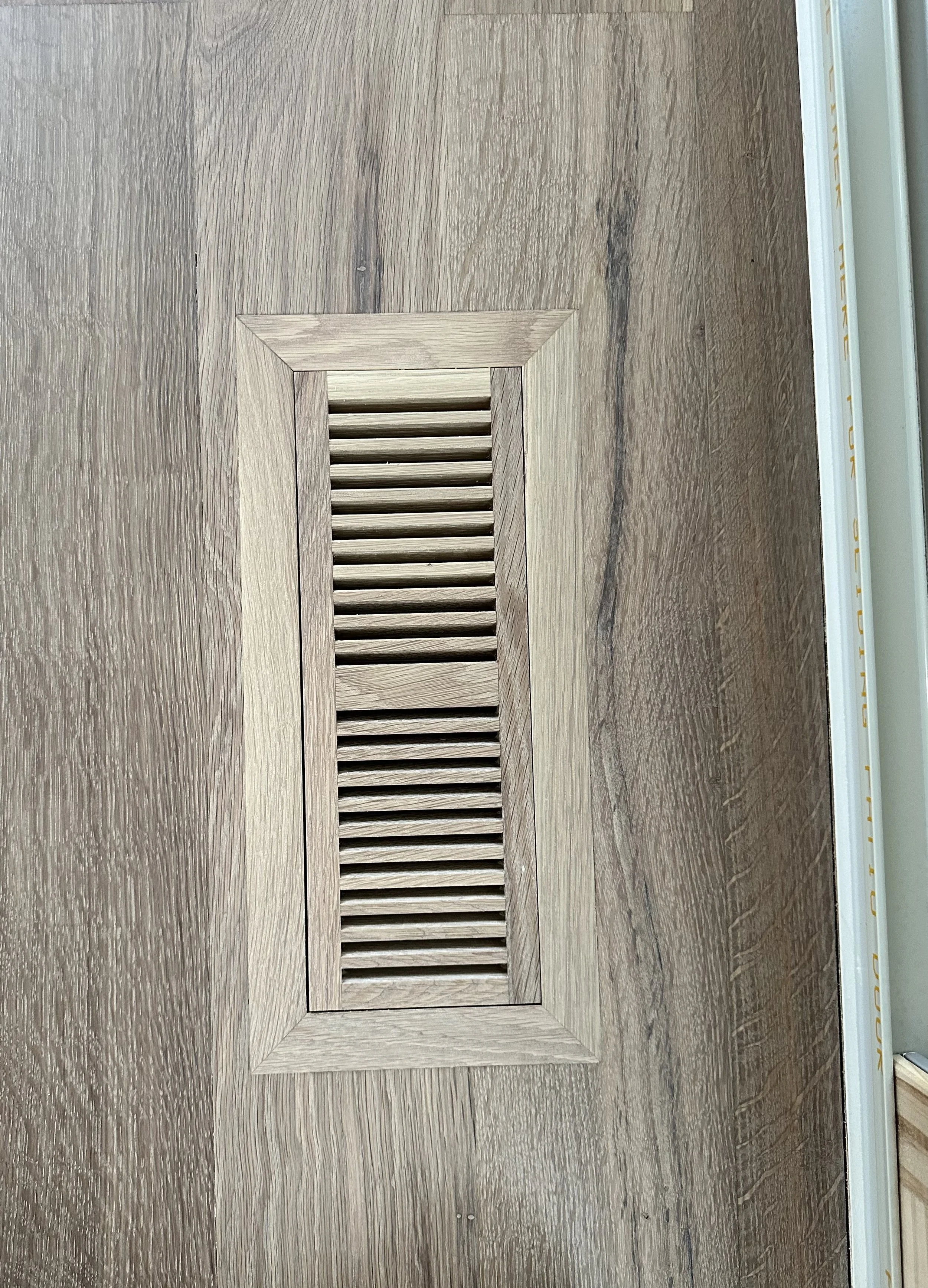 Flush mounted wooden floor vent.